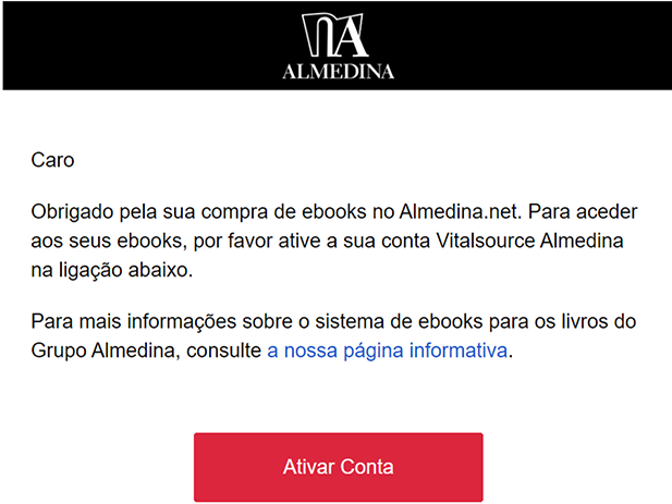 • Se já comprou anteriormente ebooks Vitalsource: neste caso receberá apenas um email de confirmação indicando que o ebook já se encontra disponível na biblioteca com uma ligação de acesso. Não é necessária nenhuma ação adicional.