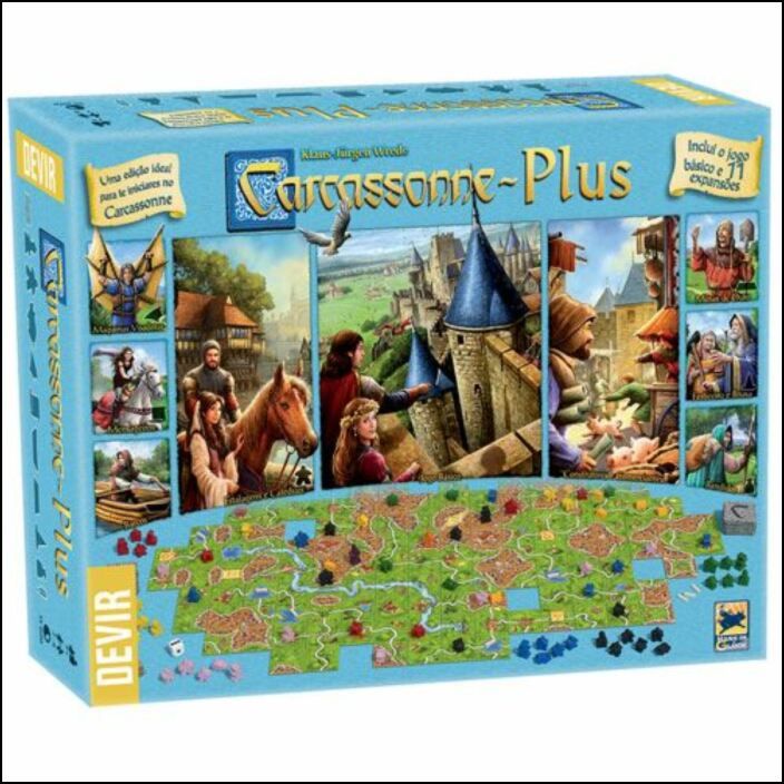 A experiência de Carcassonne pelo melhor preço. Introdução aos jogos de tabuleiro modernos. Uma magnífica prenda. Incluí o jogo básico e 11 expansões: Estalagens e Catedrais, Construtores e Comerciantes, O Abade, O Rio, Máquinas Voadoras, Barcos, Mensageiros, Minas de Ouro, O Feiticeiro e a Bruxa, Bandidos, Círculos nas Plantações. (Mecânicas de jogo: colocação de peças e trabalhadores; Número de Jogadores: 2 a 6 Jogadores; Duração: 35 Minutos; Idade: +7 Anos)